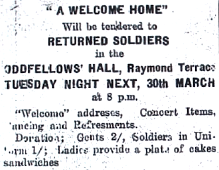 Welcome Home function for returning soldiers held at Raymond Terrace [Raymond Terrace Examiner and Lower Hunter and Port Stephens Advertiser, 25 March 1943]