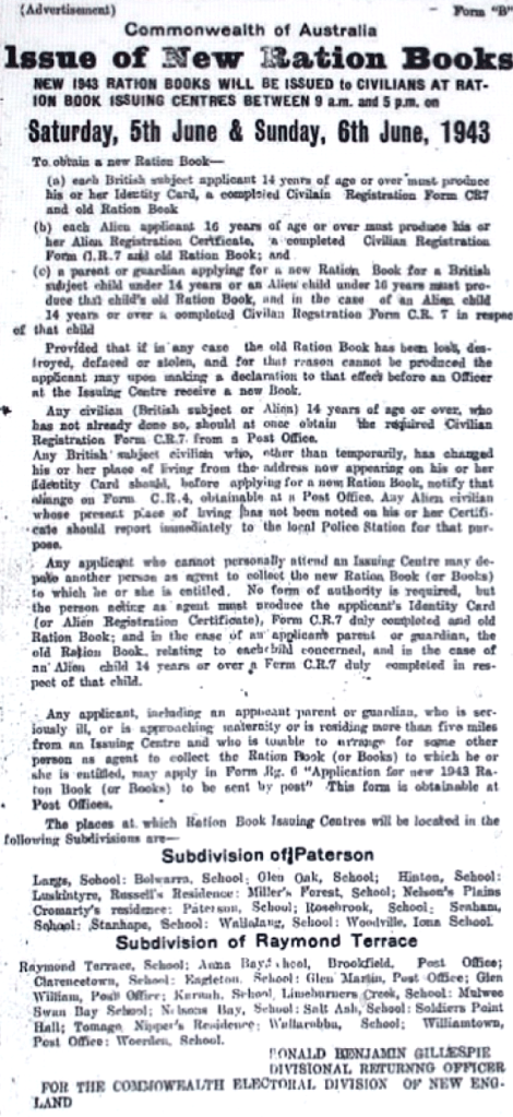 Issue of new Ration Books [Raymond Terrace Examiner and Lower Hunter and Port Stephens Advertiser, 3 June 1943]
