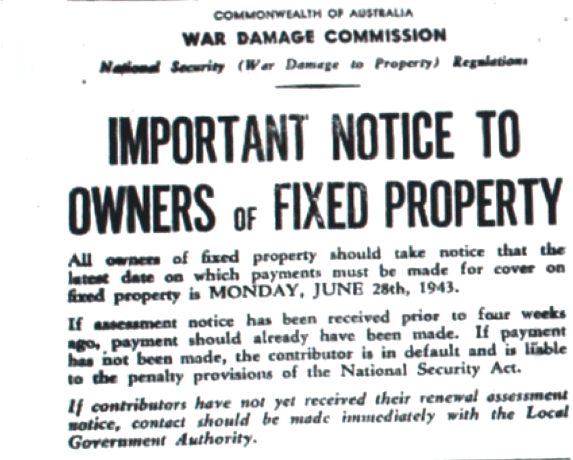Payment required for war damage property insurance [Raymond Terrace Examiner and Lower Hunter and Port Stephens Advertiser, 24 June 1943]