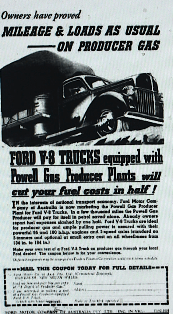 A gas producer using charcoal as the fuel, could be fitted to motor vehicles to reduce use of motor spirit [Dungog Chronicle, 18 October 1940] Also see advertisement in Dungog Chronicle, 25 July 1941 below]