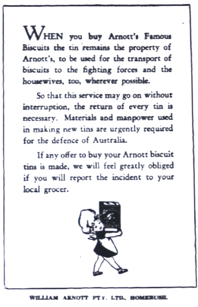 Arnott’s biscuits issued a war time warning regarding the return of their tins after use [Dungog Chronicle, 20 August 1943]