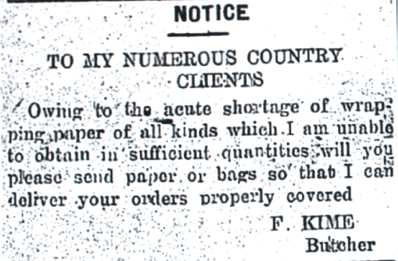 Raymond Terrace butcher experienced delivery paper shortage [Raymond Terrace Examiner and Lower Hunter and Port Stephens Advertiser, 10 September 1943]