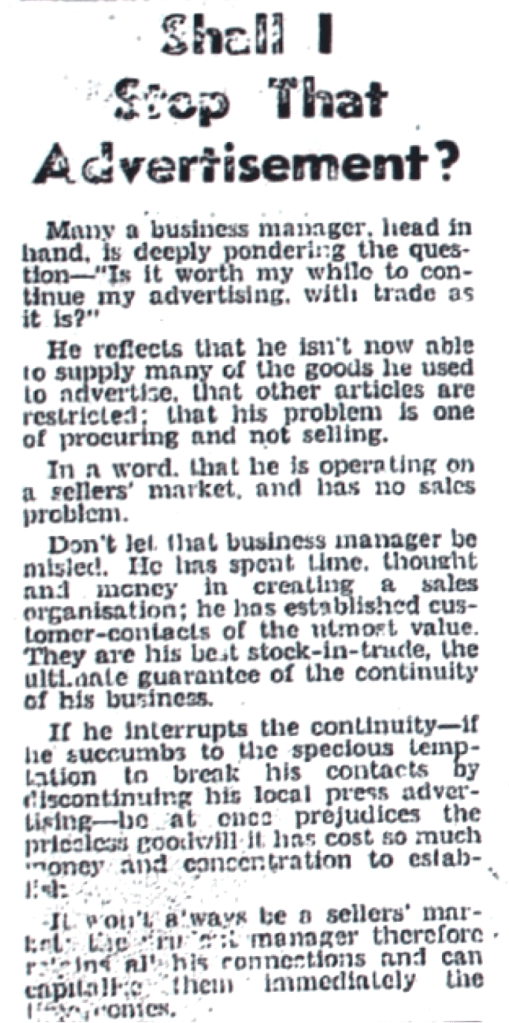 Newspaper proprietor requests business owners not to cancel advertising [Raymond Terrace Examiner and Lower Hunter and Port Stephens Advertiser, 17 September 1943]