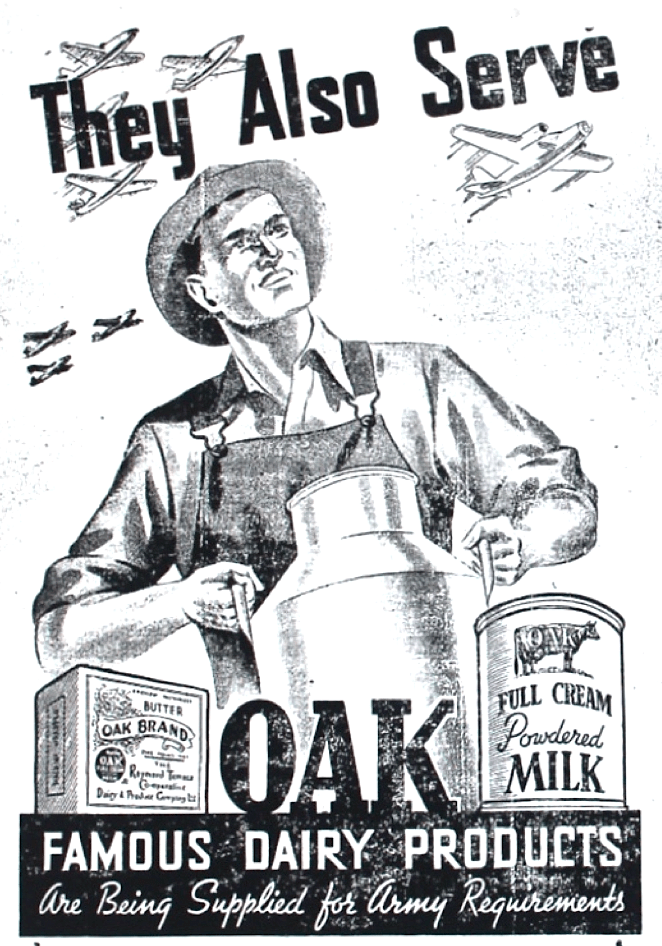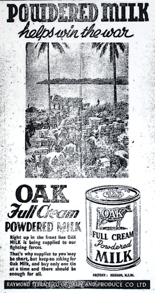 Oak milk factory at Hexham promoted the sale of their products to the Army [Raymond Terrace Examiner and Lower Hunter and Port Stephens Advertiser, 30 September 1943]
