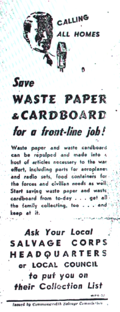 Residents urged to donate wastepaper and cardboard for war effort [Raymond Terrace Examiner and Lower Hunter and Port Stephens Advertiser, 23 December 1943]
