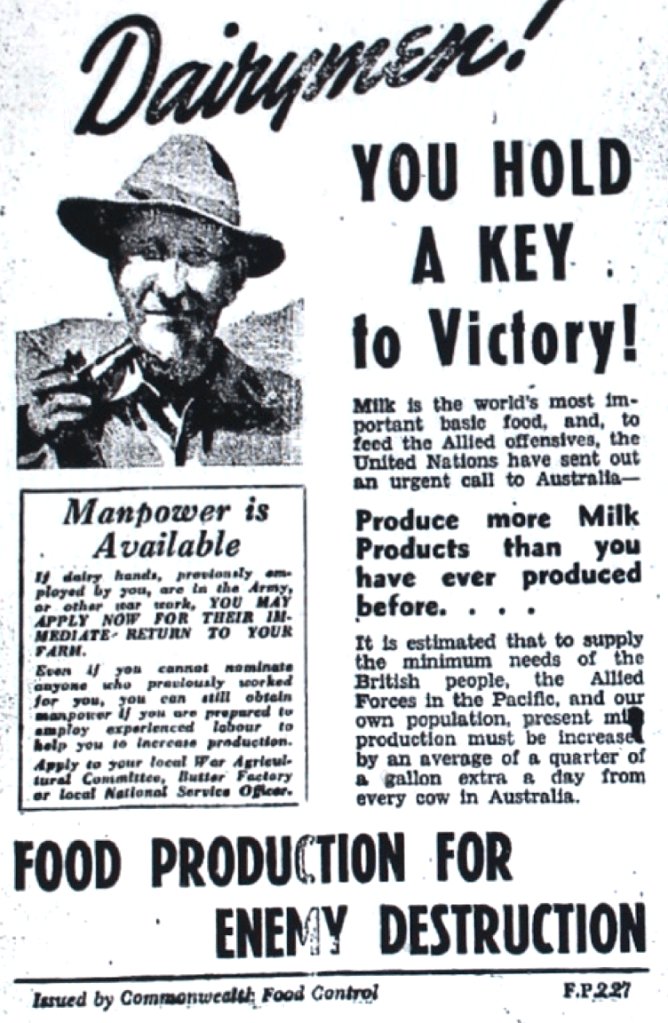 Government releases manpower to foster dairy farm production [Raymond Terrace Examiner and Lower Hunter and Port Stephens Advertiser, 6 January 1944]