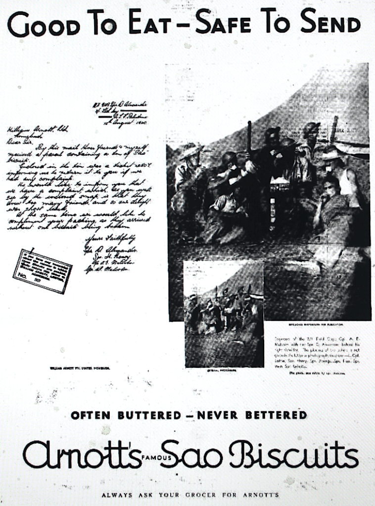 “The letter written by Spr. D. Alexander of 2/1/ Field Company, at Palestine on 13 August 1940 and addressed to William Arnott Limited, Homebush, Sydney states: By this mail three friends and myself received a parcel containing a tin of Sao biscuits. Enclosed in the tin was a ticket no. 507 informing us to return it to you if we had any complaints. We would like to inform you that we had a complaint, which, as you will see by the enclosed snap, is that they drew too many friends, as so our delight was short lived. At the same time we would like to compliment your packing, as they arrived without one biscuit being broken. Yours faithfully – D. Alexander, H. Henry, A. Malcolm and W. Malcolm. The caption for the photo states: Engineers of the 2/1 Field Coy; Cpl. A. E. Malcolm with tin; Spr. D. Alexander, behind his right shoulder. The placing of the others is not given in the letter or photograph; they are: – L. Cpl Lattie, Spr. Henry, Spr. Young, Spr. Finn, Spr. Irwin, Spr. Gillette. The photo was taken by Spr. Malcolm.”