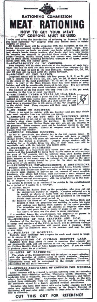 Meat rationing regulations [Raymond Terrace Examiner and Lower Hunter and Port Stephens Advertiser, 13 January 1944]