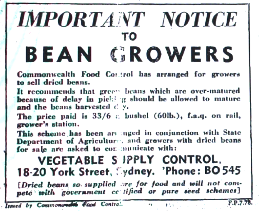 Arrangement for war time bean sales [Raymond Terrace Examiner and Lower Hunter and Port Stephens Advertiser, 13 January 1944]