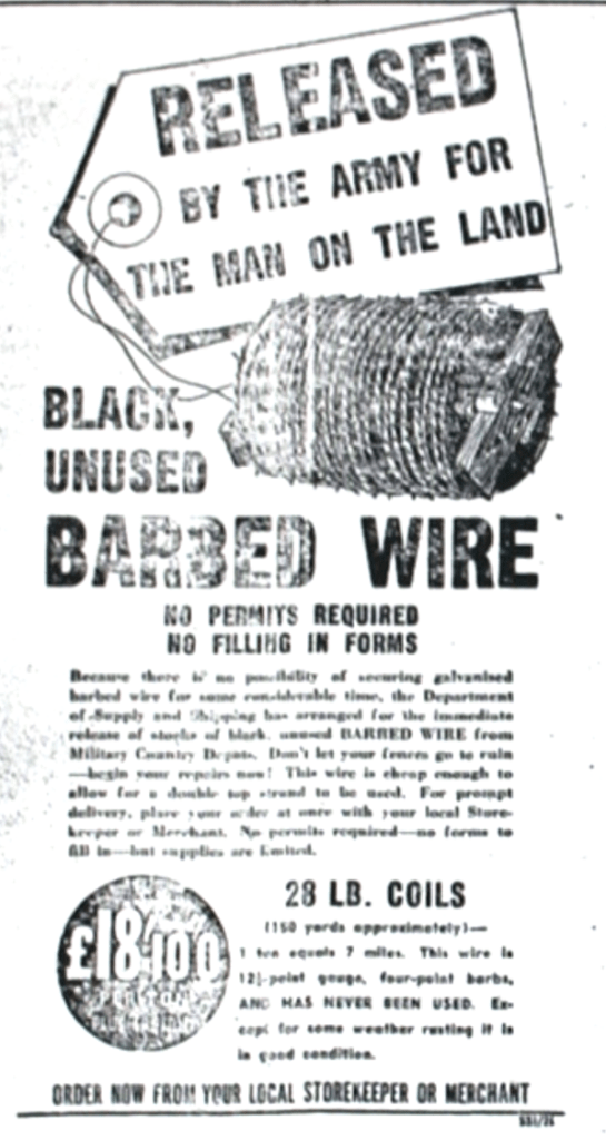 Surplus military barbed wire offered for sale [Raymond Terrace Examiner and Lower Hunter and Port Stephens Advertiser, 13 July 1944]