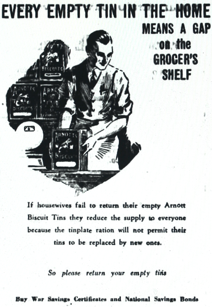 Arnott’s required the return of their biscuit tins after use as new ones could not be made [Dungog Chronicle, 24 November 1944]