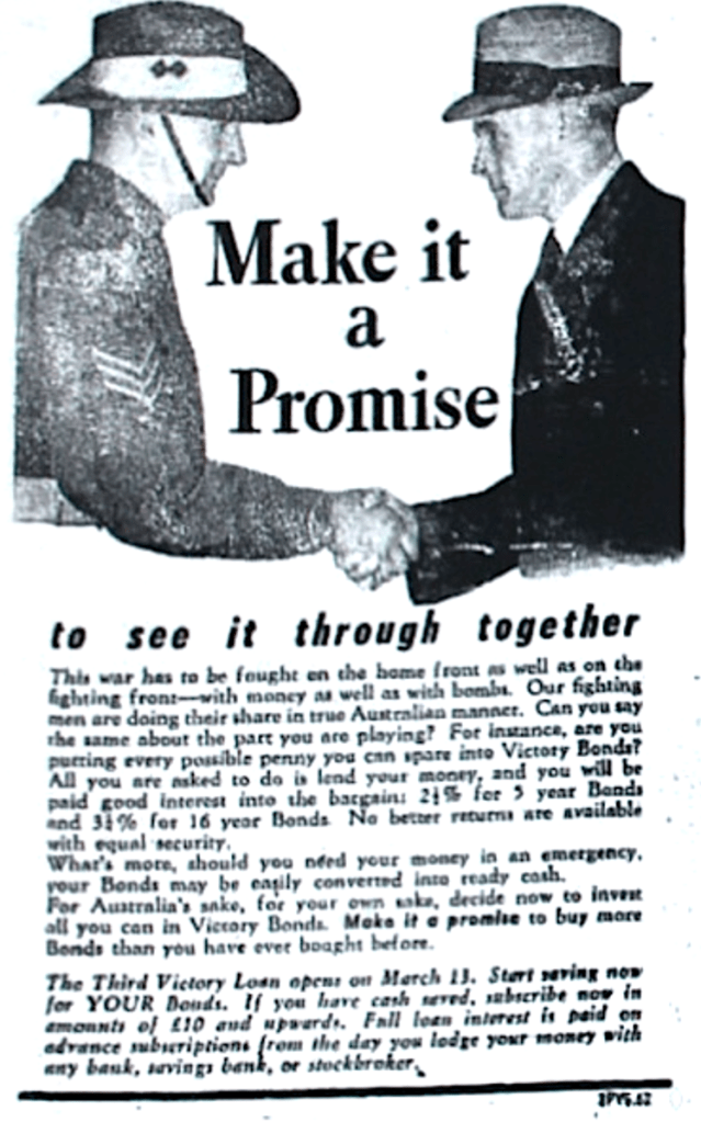 Investment sought in the Third Victory Loan [Raymond Terrace Examiner and Lower Hunter and Port Stephens Advertiser, 8 February 1945]