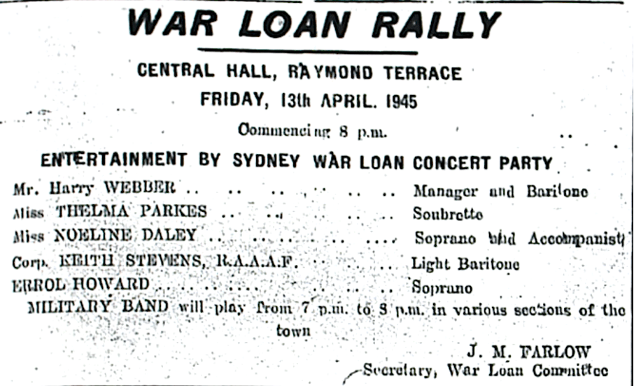 War Loan Rally and Concert at Raymond Terrace [Raymond Terrace Examiner and Lower Hunter and Port Stephens Advertiser, 22 March 1945]
