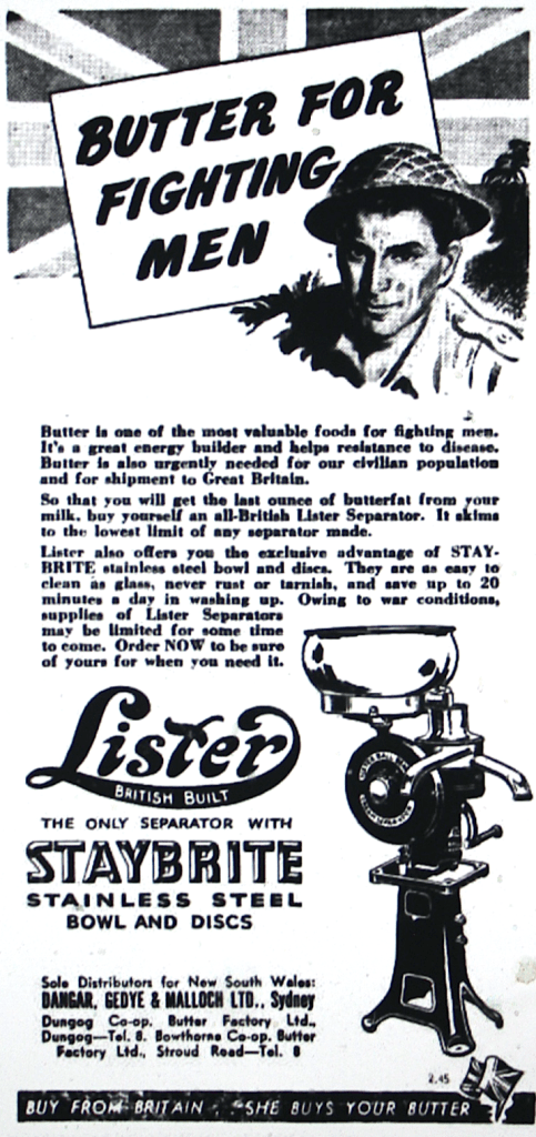 The British made dairy separator promoted as increasing production for war purposes [Dungog Chronicle, 6 April 1945]