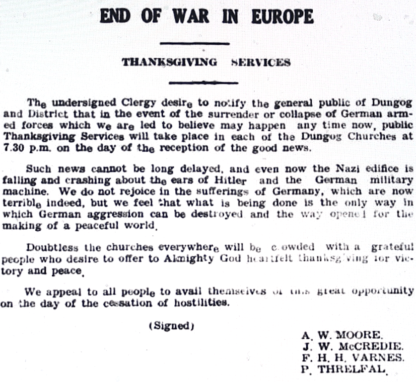 Notice that once the war ends in Europe thanksgiving services will be held in Dungog churches [Dungog Chronicle, 20 April 1945]