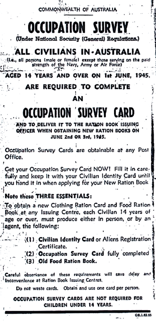 Civilians required to complete an Occupation Survey Card [Raymond Terrace Examiner and Lower Hunter and Port Stephens Advertiser, 24 May 1945]