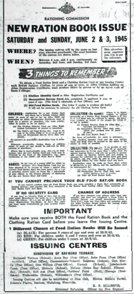 New Ration Book issue [Raymond Terrace Examiner and Lower Hunter and Port Stephens Advertiser, 24 May 1945]